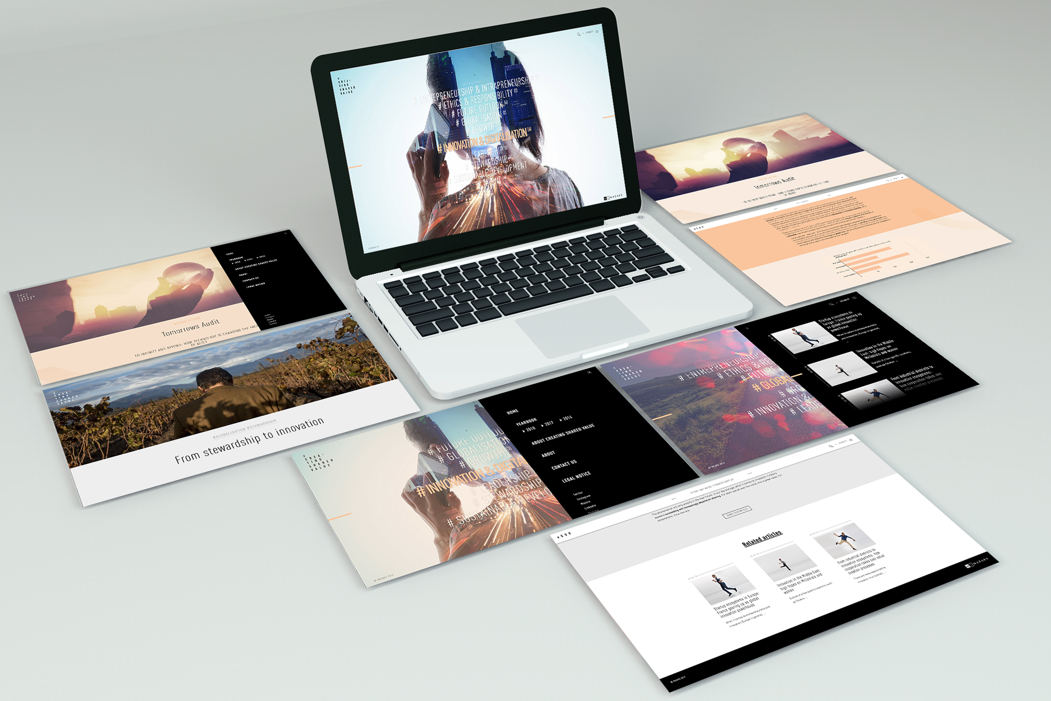 "Creating Shared Value by Mazars" is a cross-media, long-term editorial programme to reinvent the previous classic Annual Reports. It is meant as a complete ecosystem featuring a keyword-based website as the cornerstone of the programme, curation via Twitter, targeted campaigns via Facebook and LinkedIn, and a printed assets kit including Financial Statements and the Yearbook. The campaign was awarded by : Awwwards / Stategies / Digital Award Berlin The year book (print version) was delivered in more than 80 countries.